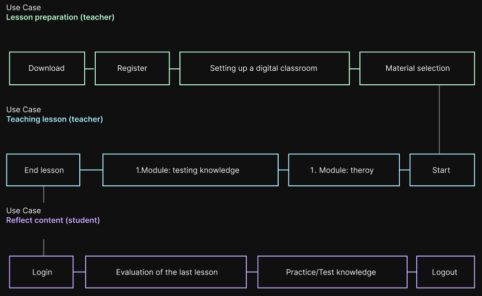 Interviews with various stakeholders shaped the requirements of the application. Methods such as personas, Crazy 8 and the creation of use cases concretised and transferred the problem to a conceptual approach. The following question was particularly important in the context of the study: Why does it make sense to use digital media?Important factors to consider were media literacy, time and teacher commitment. Likewise, analogue media should not be displaced, but should provide targeted didactic support for teaching. The process followed the classic design thinking approach. Comprehensive research into the theory behind the content, user needs and a detailed market analysis helped to flesh out the approach. Methods such as SWOT analysis and MoSCoW priorities were used to define the requirements.